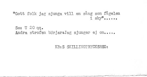 //// "Gott folk jag sjunga vill en sång som fågelen //// i sky"...... //// Se: U 20 qq. //// Ändra strofen börjarsJag sjunger ej om..... //// KB:S SKILLINGTRYCKSREG: ////