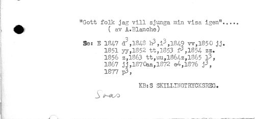 //// < //// "Gott folk jag vill sjunga min visa igen"..... //// å^) ( av A.Blanche) //// Se: E 1847 d",l848 w,l850 jj. //// 1851 yy,l852 tt,l853 f3,185A zz. //// 1856 z,l863 tt,uuyl864zyl865 l3, //// 1867 jj, 187Oaa, 1872 e^-,1876 //// 1877 p3, //// KB: S SKILIJNGTRYCKSKEG. ////