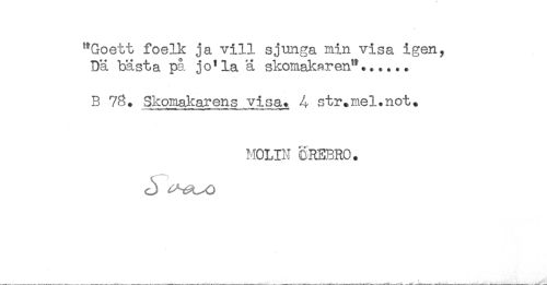 //// "Goett foelk ja vill sjunga min visa igen. //// Dä bästa på jo'la ä skomakaren"...... //// B 78. Skomakarens visa. A str.mel.not* //// MOLIN OREBRO. //// , ^ < ////