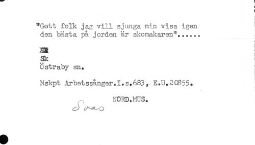 //// ) //// < //// "Gott folk jag vill sjunga min visa igen //// den bästa på jorden är skomakaren"...... //// i //// XB //// Sk //// Ostraby sn. //// Mskpt Arbetssånger.I.s.683, E.U.20655* ! //// * //// NORD.MUS. ////