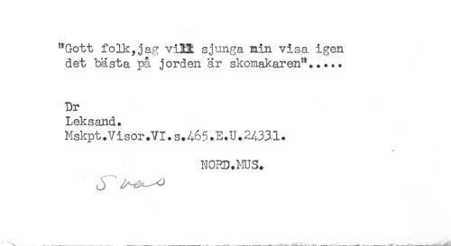 //// "Gott folk,jag viEE. sjunga min visa igen //// det bästa, på jorden ar skomakaren"..... //// Dr //// Leksand. //// Mskpt.Visor.VI.s.A65.E.U.24331. //// * //// N0RD.MUS. ////