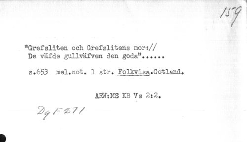 //// /fF //// t //// "Grefsliten och Grefslitens mor: //// //De väfde gnllväfven den goda"...... //// s.653 mel.not. 1 str. Folkvisa.Gotland. //// ÅI&hHS KB Vs 2:2. ////