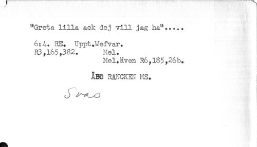 //// "Greta lilla ack dej vill jag ha"..... //// 6:4. RE. Uppt.Wefvar. //// R3,165,382. Hel. //// Mel.även R6,185,26b. //// i //// ÅB6 RANCKEN MS. //// i ////