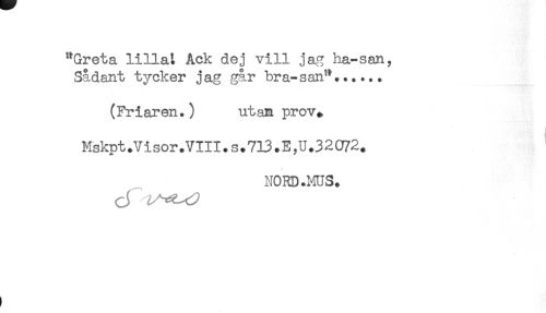 //// "Greta lillai Ack dej vill jag ha-san? //// Sådant tycker jag går bra-san"...... //// (Friaren.) utan prov* //// Mskpt.Visor .VIII. s.713.E.U.3 2072. //// NORD.MUS. //// t ////