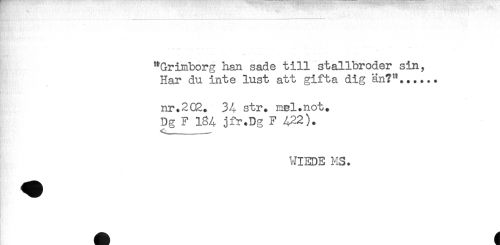 //// "Grinborg han sade till stallbroder sin? //// Har du inte lust att gifta dig än?'\..... //// nr.202. 34 str. mel.not. //// Dg F 184 jfr.Dg F 422). //// WIEDE MS. ////