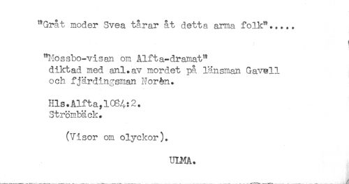 //// "Gråt moger Svea tårar åt detta arma folk"...,. //// < < ^ 1 //// - //// "Mossbo-visan om Alfta-dramat" //// diktad med anl.av mordet på länsman Gavell //// och f järdingsman Norén. //// Hls.Alfta;lce4:2. //// Strömbäck. //// (Visor om olyckor). //// UIMA. ////