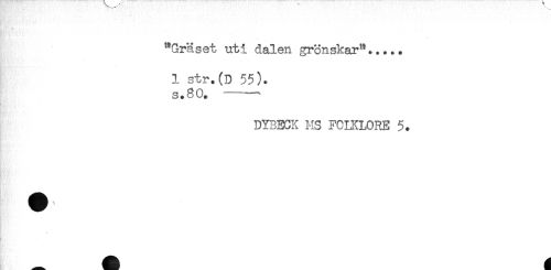 //// "Gräset uti dalen grönskar"..... //// 1 str.(D 55). //// s.80. -- //// DYBECK MS FOLKLORE 5. //// - ////