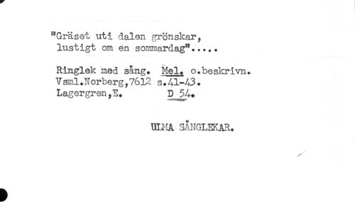 //// ) //// "Gräset uti dalen grönskar, //// lustigt om én sommardag"..... //// Ringlek med sång. Mel, o.beskrivn. //// Vsm.l.Norberg,76l2 s.41-43. //// Lagergren ,E. P ^4* //// QLHA SÅNGLEKAR. //// -- ////