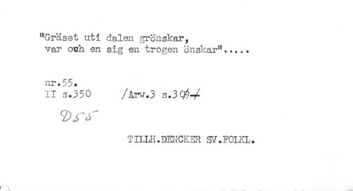 //// "Gräset uti dalen grönskar, //// var och en sig en trogen önskar"..... //// nr.55. //// II s.350 /Arv.3 s.3Q$- //// /TILUi.DEJCKER SV.FOKL. //// ____- - .... -- - . .. ////