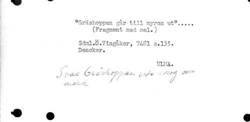 //// "Gräshoppan gar till myron ut"..... //// (Fragment med mel.) //// - //// Sdml.C.Vingåker, 7481 s.135. //// Deneker. //// UU^IA. ////