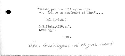 //// ^^ "Gräshoppan hon till myran gick //// o . frågte om hon kunde få läna"..... //// (mel.t.visa.) //// Ögl.Slaka,4119.s.2. //// Limburg,E. //// ULMA. //// J ^ , ^ - ^ ^ ^ ^ - ^^ ////