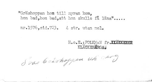 //// "Gräshoppan hon till myran kom, //// hon bad,hon bad,att hon skulle få läna"..... //// nr.1576,sid.723. 4 str. utan mel. //// H.o.E.:F0m^N fr.XIXEKESE //// KLACKEBäRGA$ //// _^ _____^.. ......_____ ////