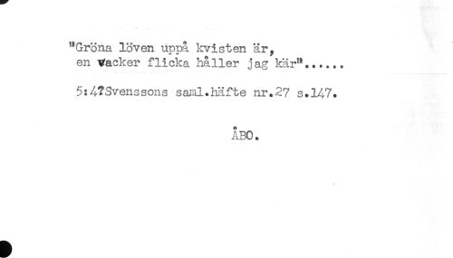 //// "Gröna löven uppå kvisten är, //// en Vacker flicka håller jag kär"...... //// 5:4?Svenssons sanil.häfte nr.27 s.147. //// ÅBO. ////
