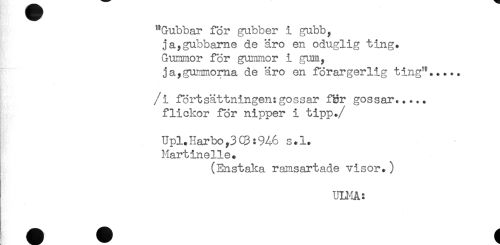 //// "Gubbar för gubber i gubb, //// jaygubbame de äro en oduglig ting. //// Gummor för gummor i gum, //// ja,gummorna de äro en förargerlig ting^..... //// /i förtsättningen:gossar för gossar..... //// flickor för nipper i tipp. //// /Upl.Harbo,3C3:%6 s.l. //// Hartinelie. //// (Enstaka ramsartade visor.) //// ULMA: ////
