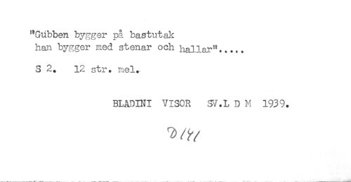 //// "Gubben bygger på bastutak //// han bygger med stenar och hallar".,... //// 3 2. 12 str. mel. //// BLADINI VISOR SV.L D M 1939. ////