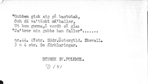//// "Gubben gick sig på bastutak y //// Och dä va*täckt nn*haller. //// Ut kom gumma,å vordt så gla: //// ^Ja'tror min gubbe han faller"....... //// * * V . - t //// nr.4?str. Södr.Cstergtld. Ekevall. //// 3 o 4 str. Se förklaringar. //// DYBECK SV.FOLKMEL. //// T) /y //// /
