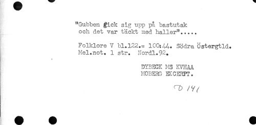 //// "Gubben gick sig upp på bastutak //// och det var täckt med haller"..... //// Folklore V bl.122.= 100:44. Södra Östergtld. //// Mel.not. 1 str. Nordl.92+ //// * //// DYBECK MS KVHAA //// MOBERG E^CERFT. ////