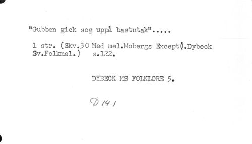 //// "Gubben gick sog uppå bastutak"..... //// 1 str. (Skv.30Hed mel.Mobergs ExceptC.Dybeck //// Sv.FoIkmel.) s.122. //// DYBECK MS FOIKLORE 5. ////