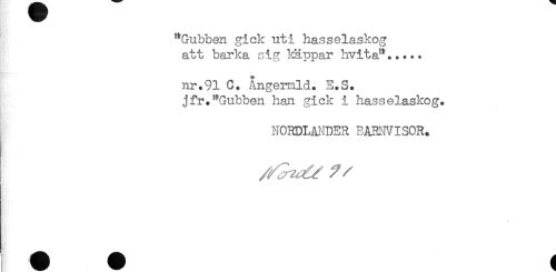 //// "Gubben gick uti hasselaskog //// att barka sig käppar hvita"..... //// nr.91 C. Ångemld. E.S. //// jfr."Gubben han gick i hasselaskog. //// * //// NORDLANDER BARNVISOR. ////