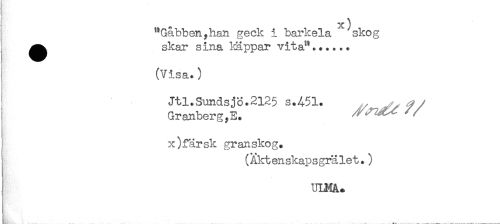 //// "Gabben,han geck i barkela skog //// j skar sina käppar vita"...... //// ; (Visa.) //// * Jtl.3undsjo.2l2$ s.4-51. ,, ^ . //// t Granberg^. //// x)färsk granskog. //// (Äktenskapsgrälet.) //// n //// ULMA. //// L _ ... ___ ////