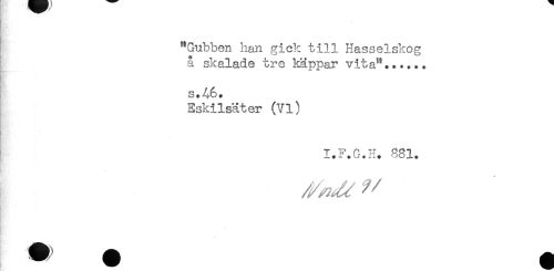 //// "Gubben han gick till Hasselskog //// ! å skalade tre käppar vita"...... //// s.46. //// Eskilsäter (VI) //// I.F.G.H. 881. //// . ////