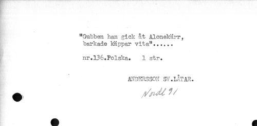 //// "Gubben han gick åt Alonekärr, //// barkade käppar vita"...... //// nr.136.Polska. 1 str. //// ANDERSSON SV.LÅT AR. //// t - //// - //// A ^ ////