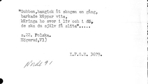 //// t //// "Gubben,hangick åt skogen en gång, //// barkade käppar vita, //// kär inga ho svor i liv och i dö^ //// de ska du själv få slita"..... //// ! //// s.22. Polska. ^ //// Högerud,Vl) //// ! //// t //// g //// I.F.G.H. 3679. j ////