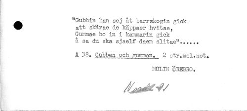 //// ^ "Gubbin han sej åt barrskogin gick //// att s^ärae de käppaer hvitae, //// Gummae ho in i kaiimiarin gick //// å sa du ska sjaelf daem slitae"...... //// Gubben och ^iman. 2 str.mel.not* //// MOLIN CREBRO. ////
