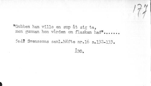 //// "Gubben han ville en sup åt sig ta, //// men gumman hon vården om flaskan had*....... //// 5:4? Svenssons saml.häfte nr.16 s.132-133. //// < //// ÅBO. //// i ////