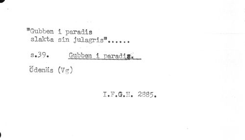 //// * -< //// "Gubben i paradis //// slakta sin julagris"...... //// * //// s.39. Gubben i paradi^- //// Cdenäs (Vg) //// I.F.G.E. 2885. ////