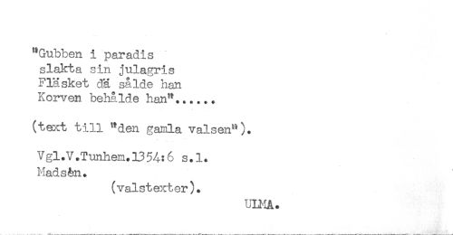 //// "Gubben i paradis //// slakta sin julagris //// Fläsket dä sålde han //// Korven behålde han"...... //// (text till "den gamla valsen"). //// Vgl.V.Tnnhem.B54:6 s.l. //// Mads&n. //// (valstexter). //// ULMA. ////