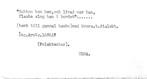 //// "Gubben kom hem,och livad var han, //// flaska slog han i bordet",....,. //// (text till gammal hambo )med overs*t.dialekt., //// Ang. Amäs. 16S64? //// (Polsktexter)., //// umA. ////