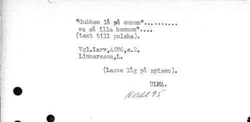 //// i "Gubben lå på ommen"..... //// ! va så illa kommen".... //// ; (text till polska). //// ; Vgl.Larv,4076,s.2. //// i Linnarsson,L. //// (Lasse låg på spisen). //// ULMA. //// A ////