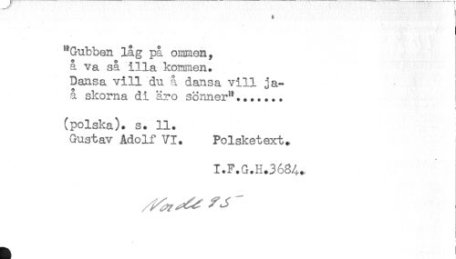 //// "Gubben låg på oimnen, //// å va så illa koismen. //// Dansa vill du å dansa vill ja- i //// å skorna di äro sönner"....... ! //// (polska), s. 11. //// Gustav Adolf VI. Polsketext* //// I.F.G.H.3684. ////