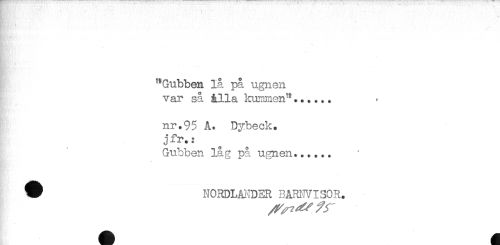 //// "Gubben lå på ugnen //// var så ålla kuimnen^...... //// nr.95 A. Dybeck. //// jfr.: //// Gubben låg på ugnen...... //// ^ NCRDLMDER BARNVISOR. ////