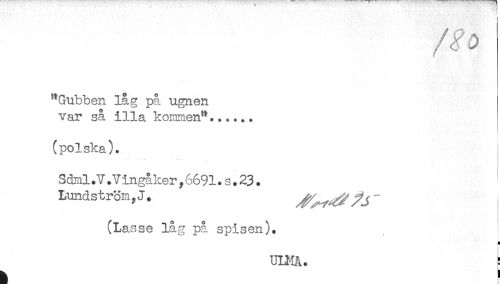 //// /F3 //// "Gubben låg på ugnen //// var så illa kornmen"...... //// (polska). //// * //// S3ml.V.Vingåker,6691. s.23. //// Lundström, J. ^^^ ' //// (Lasse låg på spisen). //// * //// ULMÅ. 5 //// . t ////