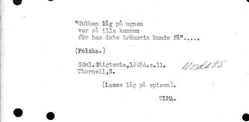 //// "Gubben lag på ugnen //// var så illa kunmien //// för han inte brännvin kunde få"..... //// ** //// (Poläka*) //// SM..St.igtonta,1205A.s.ll. //// Thornell,S. //// v //// (Lasse låg på spisen). ////