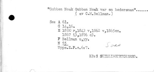 //// "Gubben Noak Gubben Noak var en hedersman"....,. //// ^^ .( av C.M.Bellman.) //// Se: A 61. //// C 14,16. //// E 1800 r,l843 v,1862 v,l865xx. //// 1867 13,1876 c3. //// F Bellman u,yy. //// Upps.Z.P.s.6:7. ^ ' //// ] KB:S SKILLINGTRYCKSREG. ////