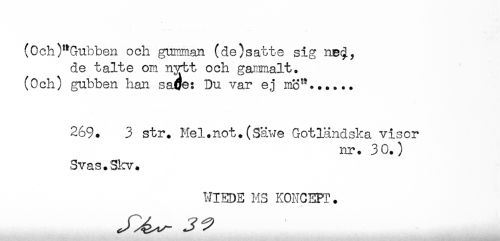 //// (Och)'*Gubben och gumman (de)satt-e sig ne^, //// de talte om nytt och gammalt, //// (Och) gubben han sade: Du var ej mö"...... //// 269. 3 str. Mel.not.(Säwe Gotländska visor //// nr. 30.) //// Svas.Skv. //// WIEDE MS KONCEPT. ////