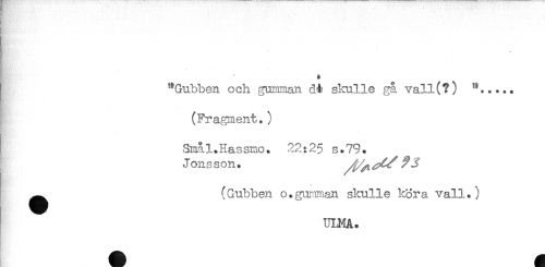 //// $ //// ! "Gubben och gumman dé skulle gå vall(?) //// (Fragment.) //// I . //// Smal.Hassmo. 32:25 s.79. //// Jonsson. ^ //// ^ (Gubben o.gumman skulle köra vall.) ////