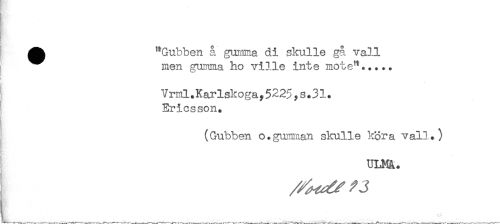 //// ^ ^Gubben å guinma di skulle gå vall //// men gumma ho ville inte mote^..... //// < //// ' Vrml.Karlskogay5225yS.3l. //// Ericsson. //// ! //// : //// (Gubben o.gumman skulle köra vall.) //// ULM&* //// Hs - //// * ^ J ////