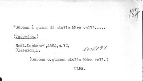 //// I //// ^Gubben å gumma di skulle köre vall^..... //// (Vaggvisa.) //// Claesson,L. //// (Gubben o.gumman skulle köra vall.) //// t ////