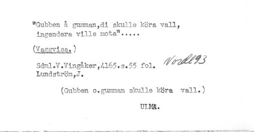//// "Gubben å gunrnian,di skulle köra vall, //// ingendera vil.le mota"..... //// (Vaggvisa.) //// Sdml.V .Vingåker ,4165. s.55 fol. //// Lundström,J. //// (Gubben o.gumman skulle köra vall.) //// UIHA. ////