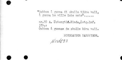 //// "Gubben å gumma di skulle tjöre vall, //// ! å gumma ho ville inte mote"...... //// nr.93 Å. OstergtH.Kinda,Ostg.lmf. //// jfr.: //// Gubben å gumman de skulle köra vall. //// NCRDLAIIDER BARNVISOR. //// # ////