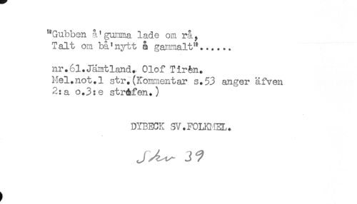 //// "Gubben å'gumma lade om rå, //// Talt om bå'nytt å gammalt"...... //// nr.61.Jämtland. Olof Tirén. //// Hel.not.1 str.(Kommentar s.53 anger äfven //// 2:a o.3:e strAfen.) //// DYBECK SV.FOLICIEL. //// Jf ////