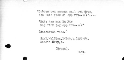 //// "Gubben och gumman satt och drog, //// och inte fick di opp röva.:/:".... //// "Hade jag min En-Fir //// nog fick jag opp rova.: //// /(Ramsartad visa.) //// Sdml.MellS sa ^10166,s.1153 -54. //// Nordin-Brip,r* //// ^^^ (Rovan). ////
