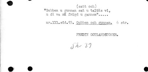 //// (satt och) //// "Gubben u gumman sat u taltäs vi, //// u dä va ma frögd u gammen^..... //// nr. 111. sid.93. Gubben och gurnnan. 6 str. //// FREDDI GOTLMDSTONER. ////
