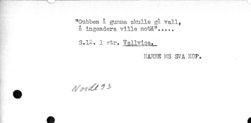 //// "Gubben å gumma skulle gå vall, //// å ingendera ville mota"...*. //// S.12. 1 str. Vallvisa. //// HAR3E MS SVA KOP. ////