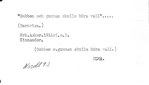 //// I //// : //// "Gubben och gurmnan skulle köra vall^..... //// (Barnvisa.) //// Nrk.Asker.191A? 5.s.3. //// Kinnander. //// (Gubben o.gumnan skulle köra vall.) //// ULKA. //// t ////