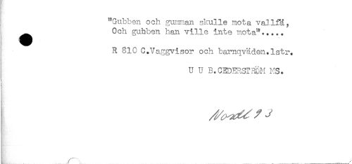 //// "Gubben och gumman skulle mota vallfä, //// ^ Och gubben han ville inte mota"..... //// R 810 C.Vaggvisor och barnqväden.lstr. //// U U B.CEDERSTmM MS. //// r _ _ ____ ////
